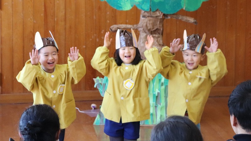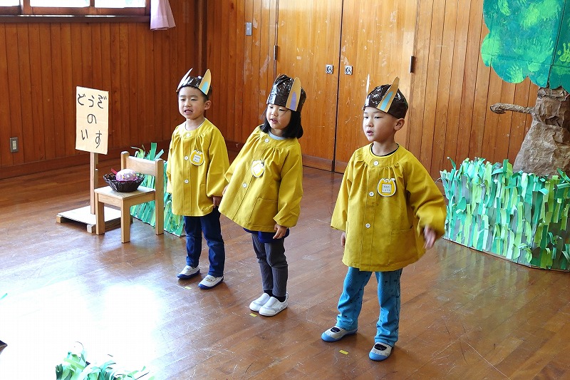 たんぽぽ組(年少):お話劇「どうぞのいす」3人とは思えないほどの大きな歌声が響き渡り、まさに「たんぽぽパワー全開」!3匹のロバがのんびりとお昼寝するシーンでは、本当にお休みしているような愛らしさでした。全員が役になりきって、心から楽しそうに演じる姿が印象的でした。