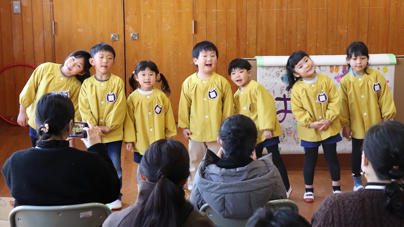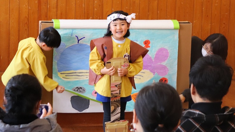 すみれ組(年長):歌と劇「すみれおんせんものがたり」 元気いっぱいの歌声が、会場の皆さんに「元気」と「笑顔」を届けてくれました。草山の昔話『くじらと温泉』の劇では、手作りの紙芝居や小道具を使い、年長さんらしい工夫が光っていました。みんなで仲良く温泉に浸かる場面では、見ているこちらの心までポカポカと温まるような発表でした。