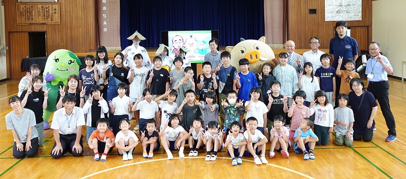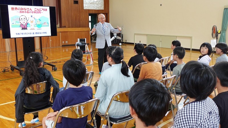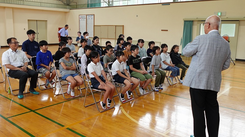 丹波篠山市長酒井隆明氏が、9月26日(金)に来校されました。当日は、3年生から6年生の児童が、酒井市長から丹波篠山市の歴史、文化、そして豊かな農産物などについて、詳しく貴重なお話を伺いました。市長のお話を通じて、子どもたちは自分たちが住んでいる丹波篠山市が持つ独自の良さや誇れる点に改めて気づき、郷土の素晴らしさを再認識する貴重な学びの機会となりました。その後、全校生でまるいのやまめりんと一緒にデカンショを踊りました。