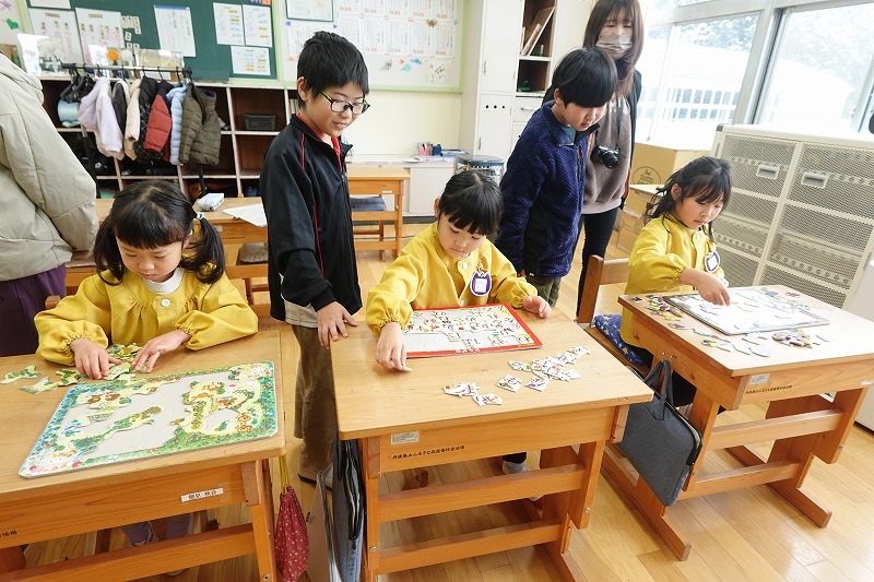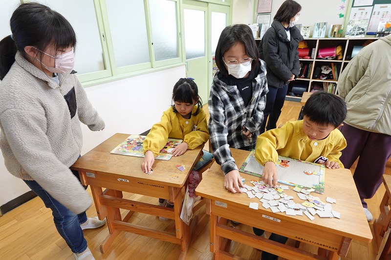 1月27日(火)、5・6年生の教室にて、5年生とすみれ組(年長児)の交流会が行われました。この会は、「すみれ組のみんなが期待を胸に入学し、楽しい小学校生活を送ってほしい」という願いを込めて、5年生が自分たちで企画・招待したものです。5年生は、小学校生活で大切な力として「集中力」と「記憶力」に注目。それらを楽しく育めるよう、「集中力のパズル」と「記憶力のお買い物ゲーム」を準備しました。パズルでは、すみれ組の子どもたちが時を忘れて黙々と取り組む姿が見られました。