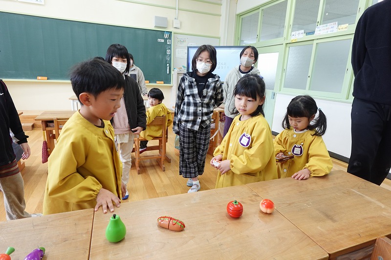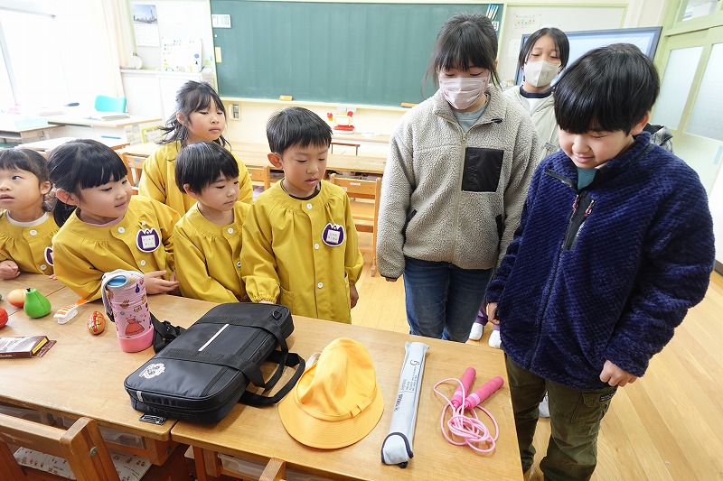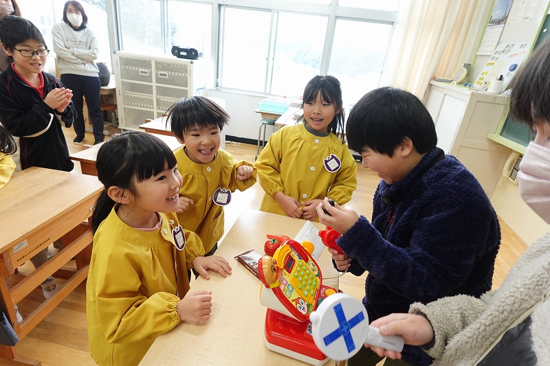 お買い物ゲームでは、食べ物だけでなく、縄跳びやリコーダーといった「学校で使う道具」をお題にする工夫も。5年生のアドバイスを聞きながら、一生懸命に道具を探しに行く姿が印象的でした。