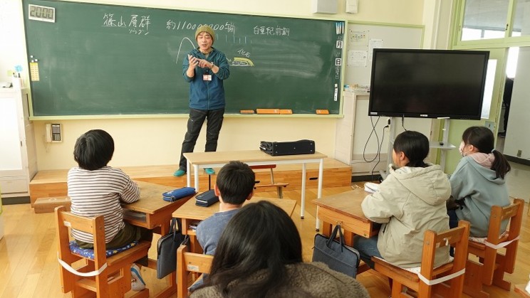 12月19日(金)、5・6年生が篠山層群の学習をしました。講師として「兵庫県立人と自然の博物館」の専門家をお招きし、1億1000万年前(白亜紀前期)の地層「篠山層群」について詳しくお話を伺いました。