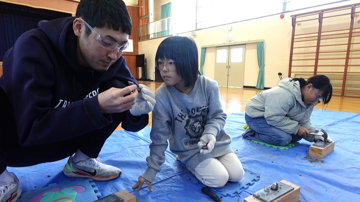 その後、実際に恐竜の骨が発見された川代付近の石を使い、化石探しに挑戦。「何か入っているかも!」と夢中で石を割るなか、なんと恐竜の卵の化石が発見されるという驚きの展開がありました! さらに貝の化石も多数見つかり、子どもたちは大興奮。