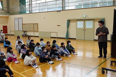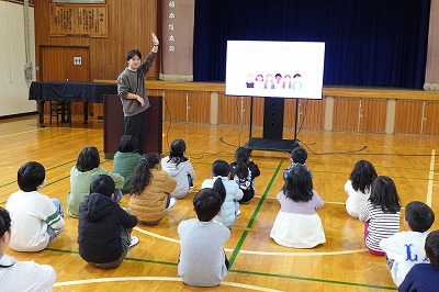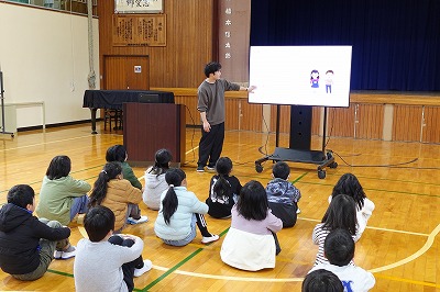 3・4年生総合的な学習の発表「黒豆で地域活性化 ~助けて!黒豆レンジャー~」自分たちが育てた黒豆を楽市楽座で販売したり、甲子園大学栄養学部の学生さんと黒豆料理を作ったりした学習の発表でした。大きな声でしっかり発表ができていました。劇あり、クイズあり、荒えもんありのとても楽しい発表でしたね。ちなみに、台本は自分たちで意見を出し合って作ったものです。